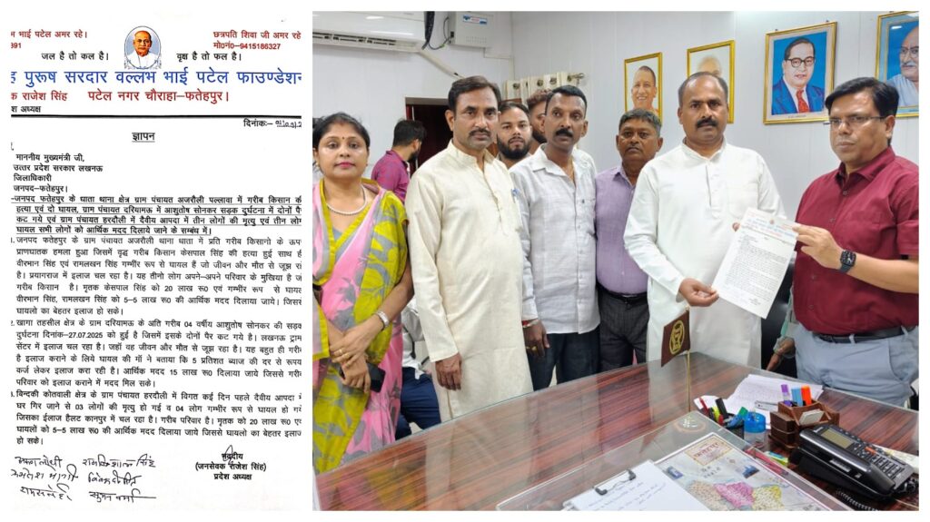 Fatehpur: जनपद फतेहपुर में लगातार हो रही घटनाओं ने कई परिवारों को गहरी चोट दी है। पीड़ित परिजनों ने मुख्यमंत्री योगी आदित्यनाथ से आर्थिक मदद की मांग की है। जिलाधिकारी के माध्यम से भेजे गए प्रार्थना पत्र में तीन प्रमुख घटनाओं का जिक्र किया गया है।