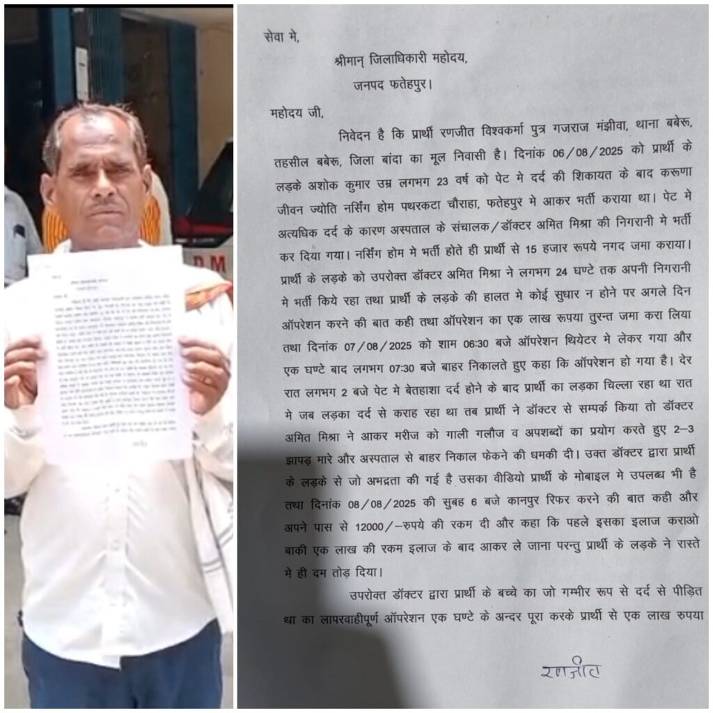 Fatehpur: जिले के सदर कोतवाली क्षेत्र स्थित करूणा जीवन ज्योति अस्पताल पर एक बार फिर लापरवाही का गंभीर आरोप लगा है। जानकारी के मुताबिक, सात अगस्त को एक युवक का पेट का ऑपरेशन अस्पताल में किया गया था, लेकिन आरोप है कि ऑपरेशन गैर-डिग्रीधारी व्यक्ति ने किया।